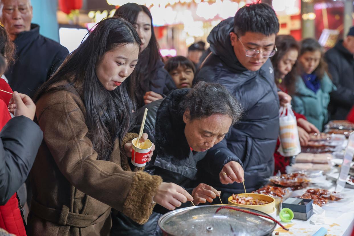 2月1日晚,重庆市两江新区观音桥步行街,市民在现场品尝巴渝“土特产”。新华社记者 陈诚 摄