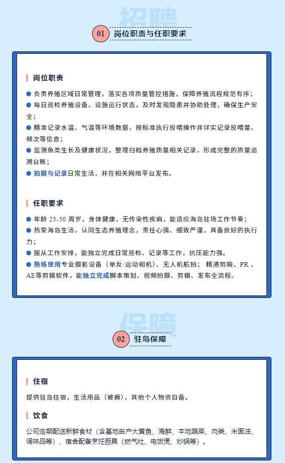 这份工作竟然还在招人。1月29日,浙江中惟东寨岛养殖有限公司发布了招聘公告,岗位职责除了上述内容,还有拍摄与记录日常生活等,年龄要求25至50周岁,能适应海岛驻场工作节奏等。