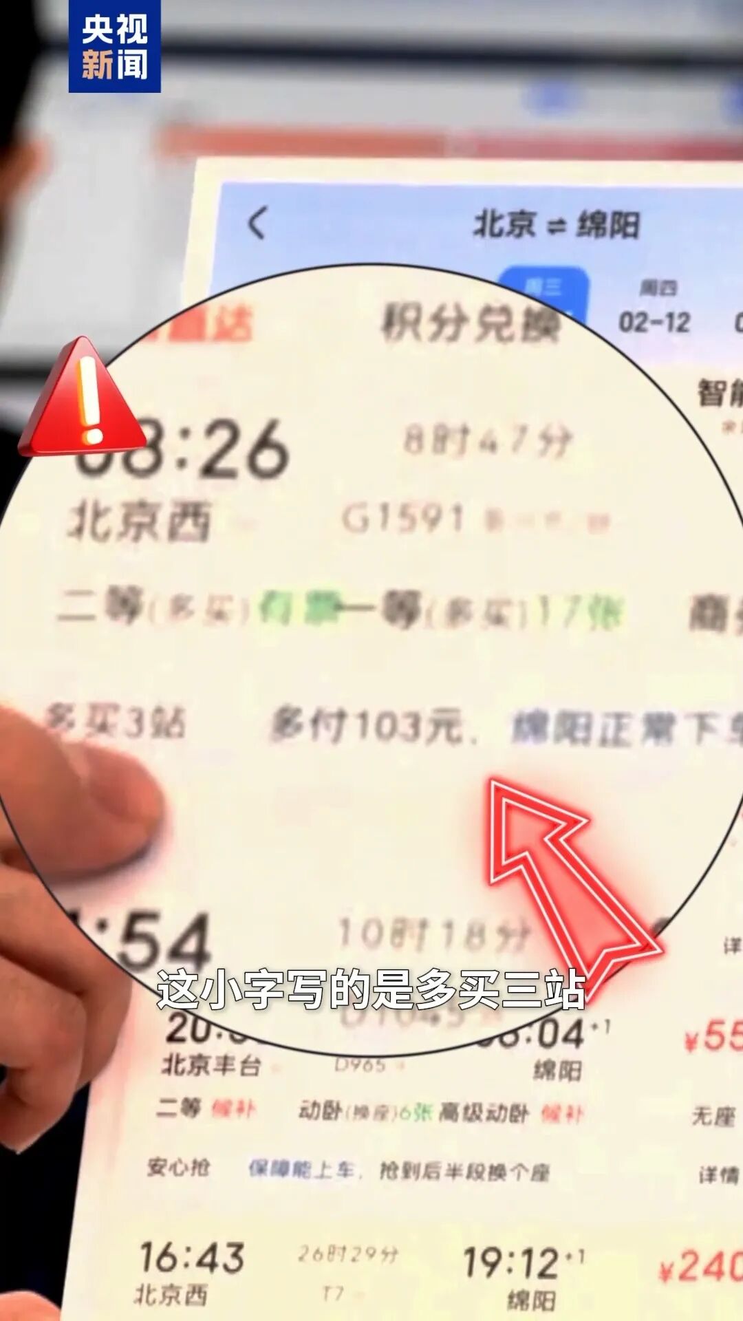铁科院电子所数智客运研究室 赵千谊:这张图仔细看,虽然抢票软件显示有票,但是其实底下还有一行小字,这小字写的是:多买三站,多付103元。什么意思?