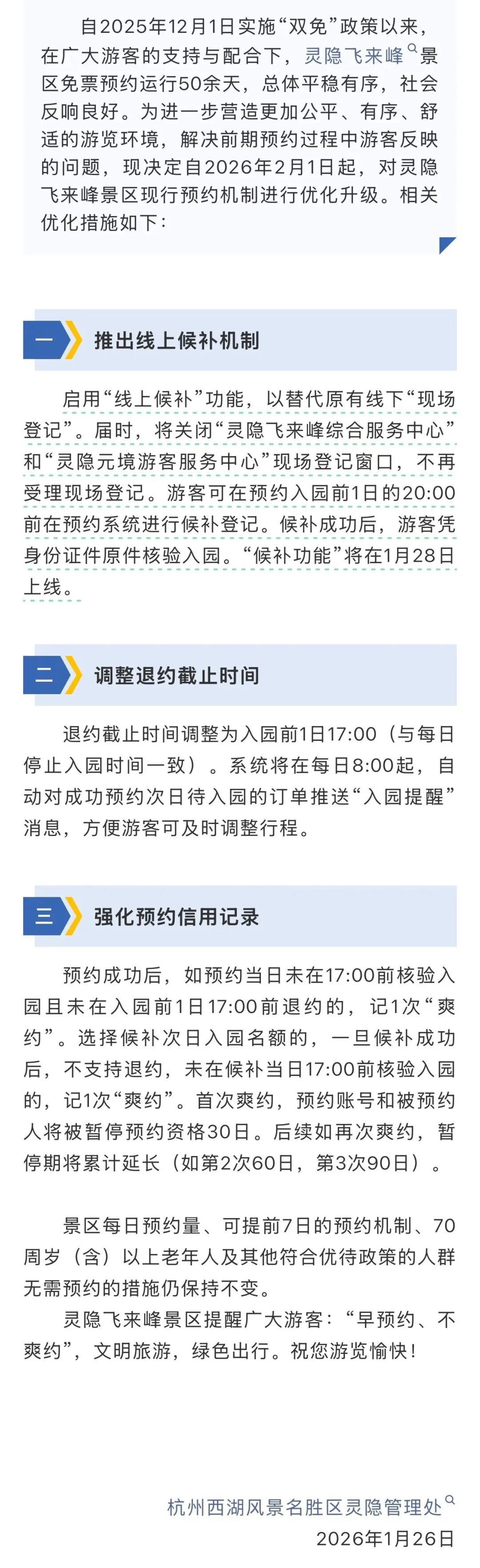 记者发现,灵隐飞来峰景区官方账号1月26日发布《关于优化杭州灵隐飞来峰景区预约机制的通告》。