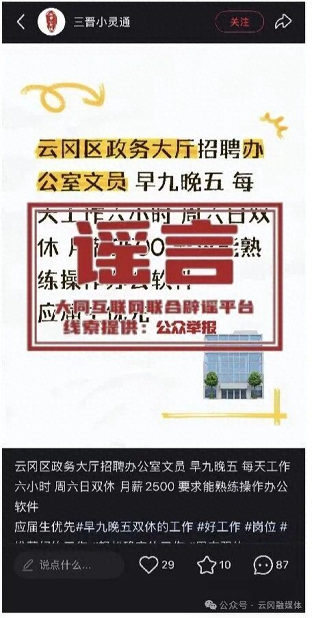 山西大同市云冈区政务大厅招聘办公室文员?经核实:为不实信息