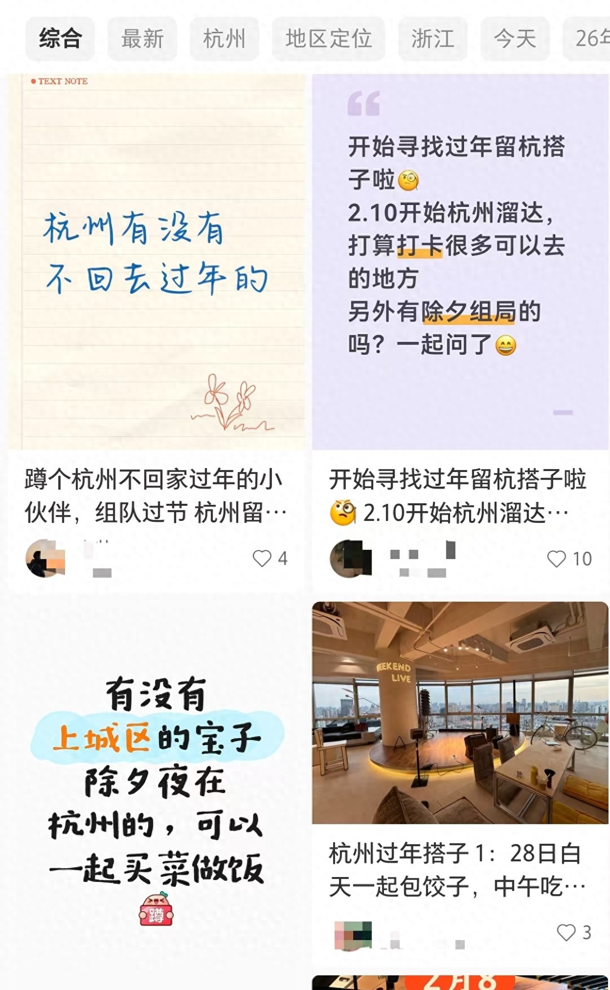 “留杭过年搭子征集!本人是来杭6年的打工人,今年决定继续留杭过年,不想一个人吃外卖看春晚,现征集14位留杭搭子,一起热热闹闹过大年……”这是大辉在社交媒体上发布的“过年搭子征集帖”。