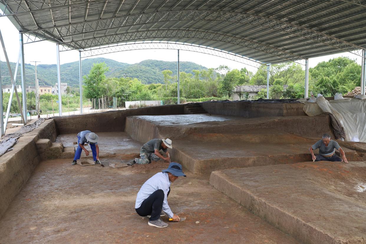 图为考古工作者在姚家湾遗址开展发掘工作。(受访者供图) 负责此项目的浙江省文物考古研究所副研究员朱雪菲介绍说,2019年,浙江省和舟山市的文物考古部门启动了舟山群岛地区主动性调查工作,2022年在岱山发现了姚家湾遗址,2023年在金塘发现了庵跟岙遗址。2025年,经国家文物局批准,浙江省文物考古研究所对这两处遗址进行了发掘,都发现了相当于良渚文化中晚期、最早距今已有4800年至4600年的制盐遗存。
