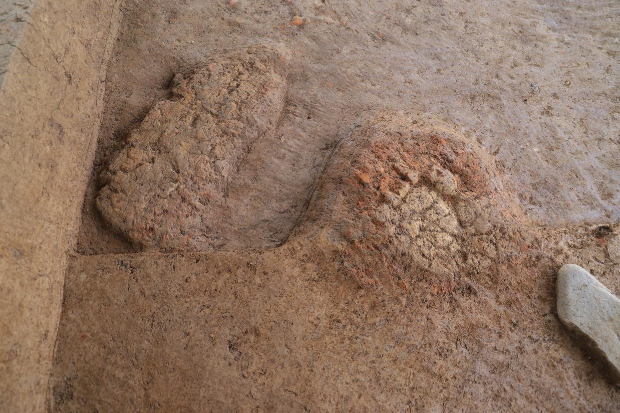 图为良渚时期的盐灶灶底。(受访者供图) 考古发现,良渚时期的舟山先民已经掌握了多环节的煮盐工艺,留下了不少遗迹。姚家湾遗址发现三火塘盐灶灶底、煎盐盘废弃堆积、煎盐盘堆烧区、盐泥堆放区等一系列制盐遗存。庵跟岙遗址也发现盐灶灶底、盐泥废料堆等遗存。朱雪菲说,这两处遗址的先民都是在人工堆筑的土台上制盐的,他们在堆筑土台时,也会筑入制盐的废料,做到物尽其用。