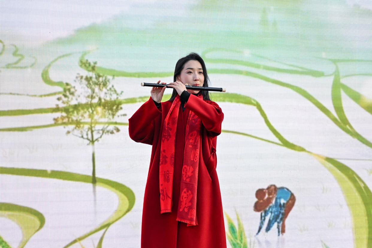 2月4日,中国歌剧舞剧院竹笛、排箫演奏家孙楚泊在活动上吹奏竹笛曲《扬鞭催马运粮忙》。新华社记者 李鑫 摄