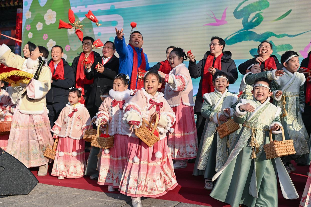 2月4日,“春姑娘”“牛童”和嘉宾向市民抛掷福袋。新华社记者 李鑫 摄