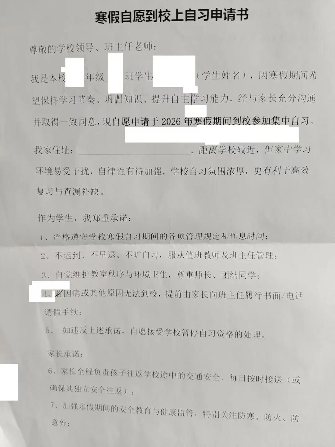 记者转而联系学生家长,一家长提供了学校曾让他们签署的《寒假自愿到校上自习申请书》,其内容显示,“因寒假期间希望保持学习节奏,巩固知识,提升自主学习能力,经与家长充分沟通并取得一致同意,现自愿申请于2026年寒假期间到校参加集中自习。”并明确要求学生要“严格遵守学校寒假自习期间的各项管理规定和作息时间:不迟到,不早退,不旷自习,服从值班教师及班主任管理。否则暂停自习资格。”对此,家长无奈地说,“说是自习且自愿参与,但谁敢让孩子不去啊?如果不去,等开学了将落后别人一大截,孩子也不敢不去。”