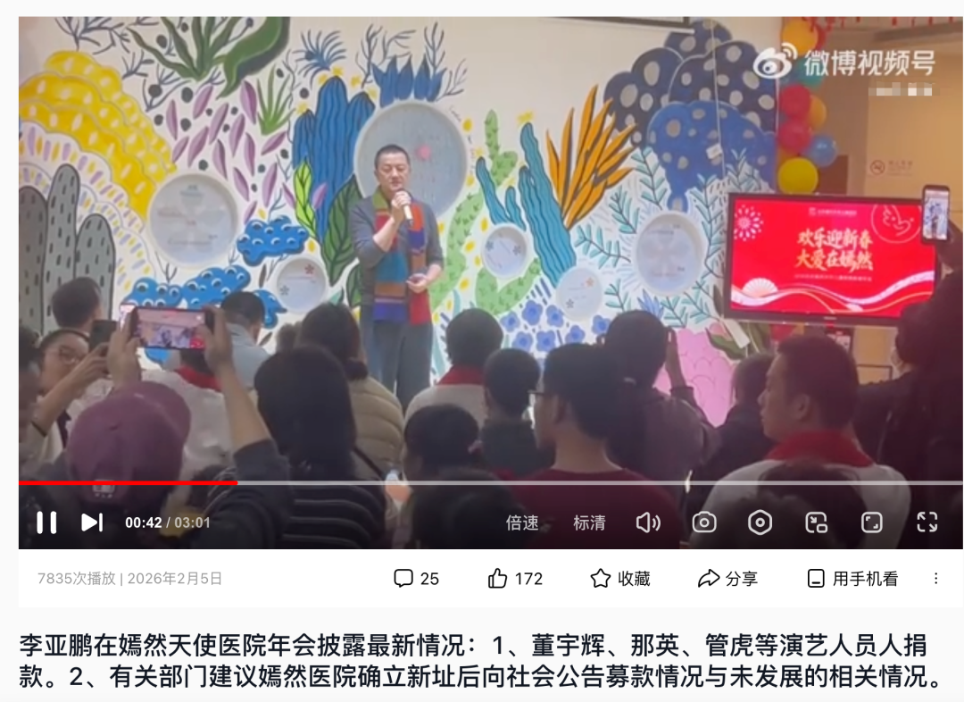 根据网友发布的视频,4日李亚鹏在年会上透露,近期,朝阳区各级主管部门在积极协调,包括新院选址、审批资质等全力以赴帮助嫣然医院,并建议医院确立新址后向社会公告募款情况与未发展的相关情况。此外,李亚鹏提到董宇辉、那英、管虎等演艺人员也第一时间捐款,后续会由主管部门向社会发布公告。在发言最后,李亚鹏哽咽表示,“在全社会各方关怀和支持下,我想我们应该可以渡过这个难关。”