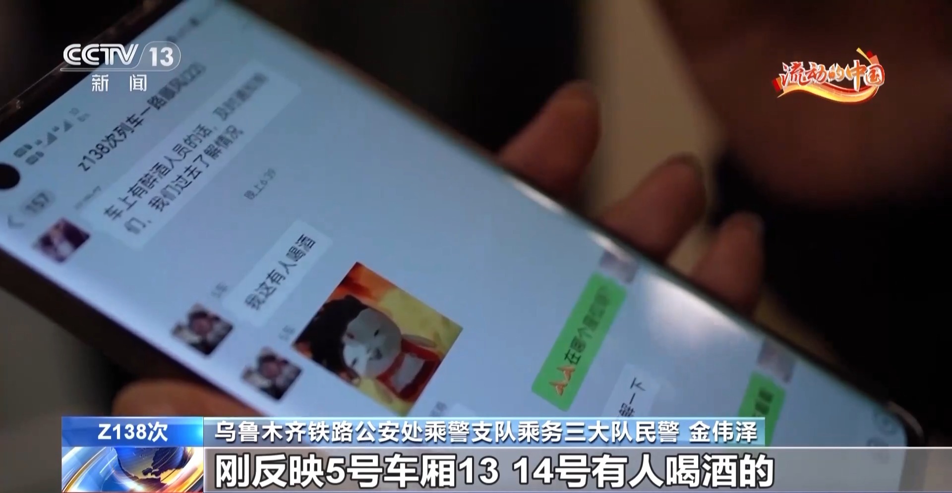 乌鲁木齐铁路公安处乘警支队乘务三大队民警 金伟泽:“Z138次联防员志愿者”群刚刚反映5号车厢13、14号有人喝酒,现在去做一个喝酒的温馨提示,看他们喝到什么程度了。