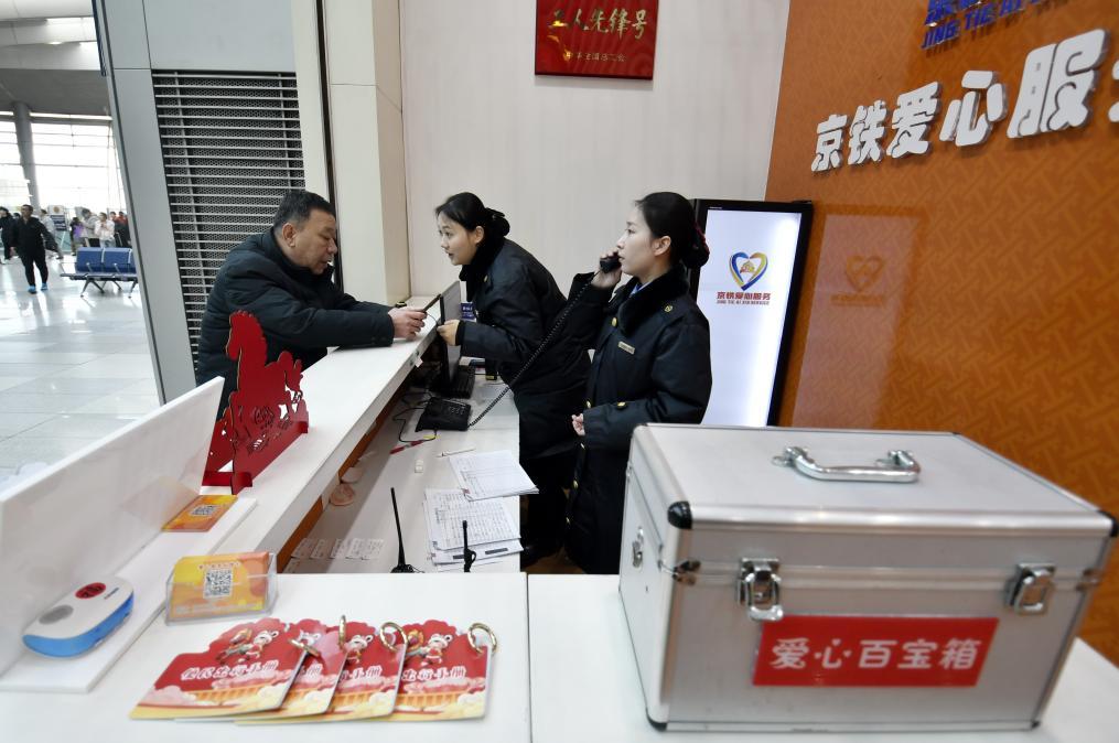 2月1日,北京南站爱心服务台的工作人员为旅客提供咨询服务。新华社记者 李欣 摄