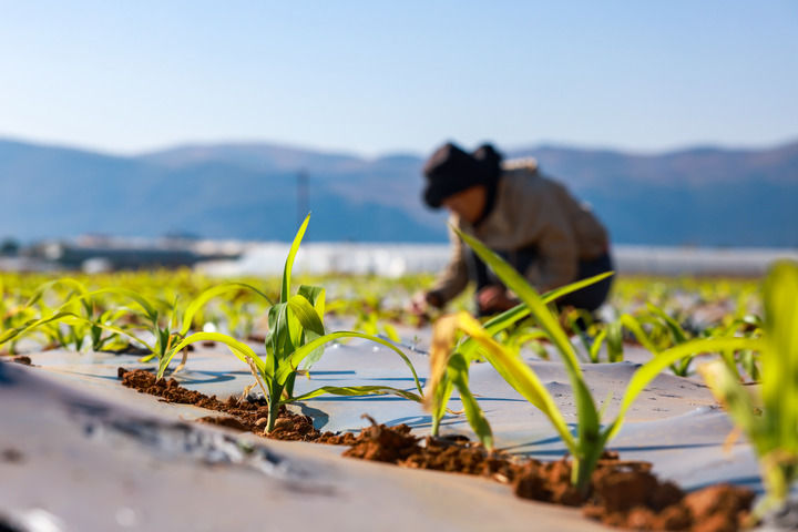 2026年2月1日,农户在云南省红河哈尼族彝族自治州开远市羊街乡的农田里管护发芽出土的玉米。新华社发(陶家淇 摄)
