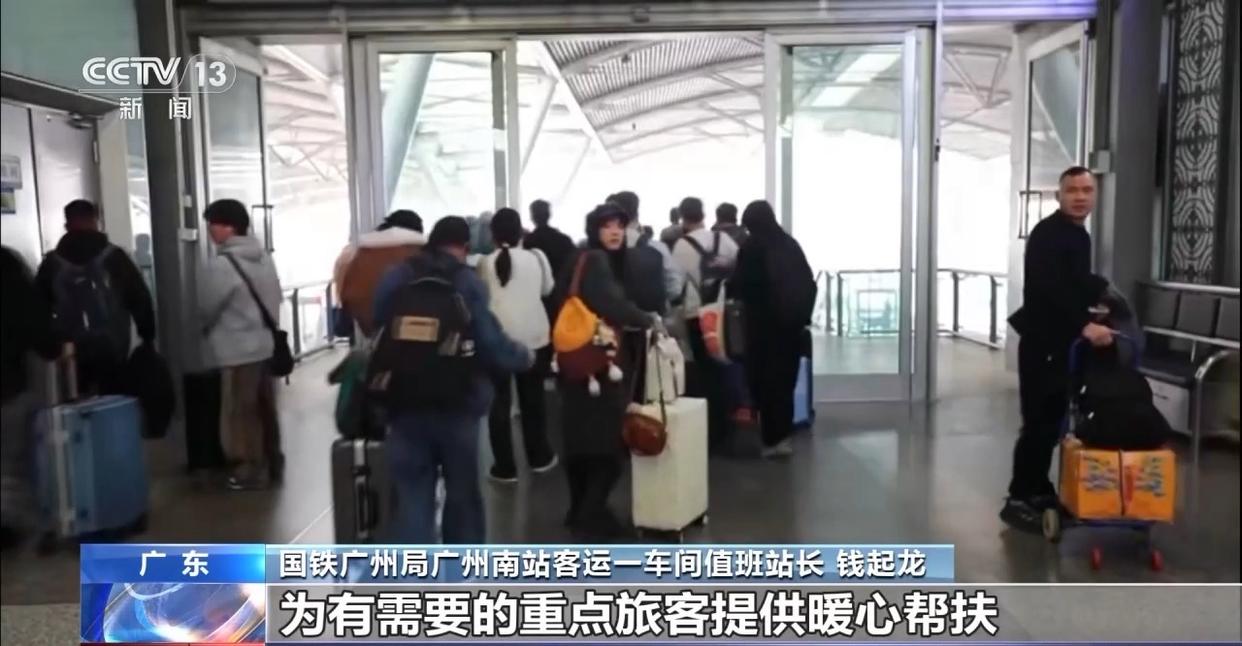 国铁广州局广州南站客运一车间值班站长 钱起龙:车站为务工团体旅客开通进站绿色通道,在进站口、楼梯口、站台边增派人员,加强安全防护,安排青年志愿者为有需要的重点旅客提供暖心帮扶。