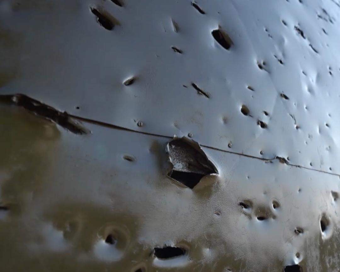 ▲40多年前,雷达操作员值班方舱上留下的弹孔。