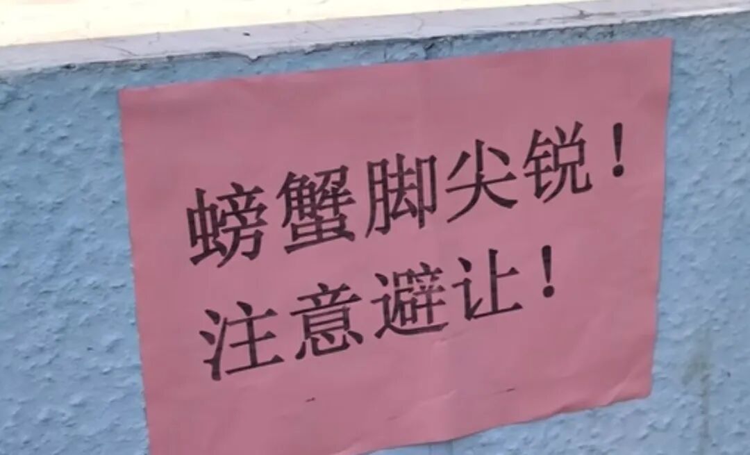 “螃蟹”两侧各有4个尖锐壳刺,离地面从120厘米到170厘米落错分布,全都悬空指向盲道。雕塑两侧贴有两张“螃蟹脚尖锐!注意避让!”的红纸警示,下方放置了两节护栏围挡。