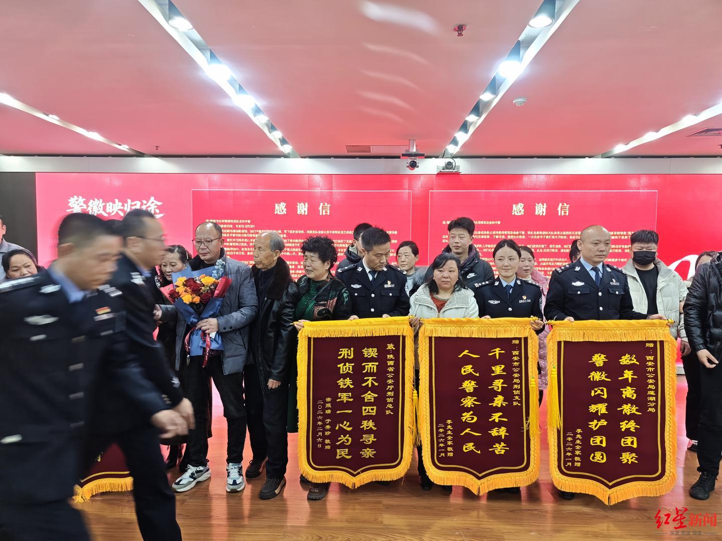 近年来,西安公安深入推进“团圆”行动,积极运用“专业+机制+大数据”新型警务模式,2025年以来已成功找回10名被拐人员,破获积案10起。认亲仪式现场,两个家庭为公安机关送上锦旗。