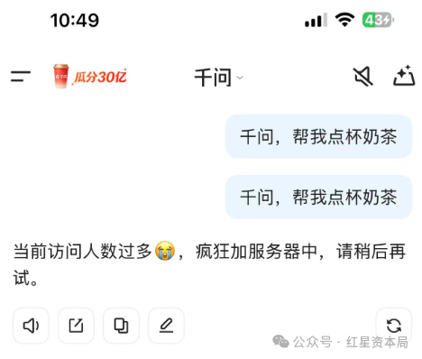 随后,千问在社交平台发布动态回应称,免单送奶茶活动太火爆,正在紧急加资源,全力保障顺畅。