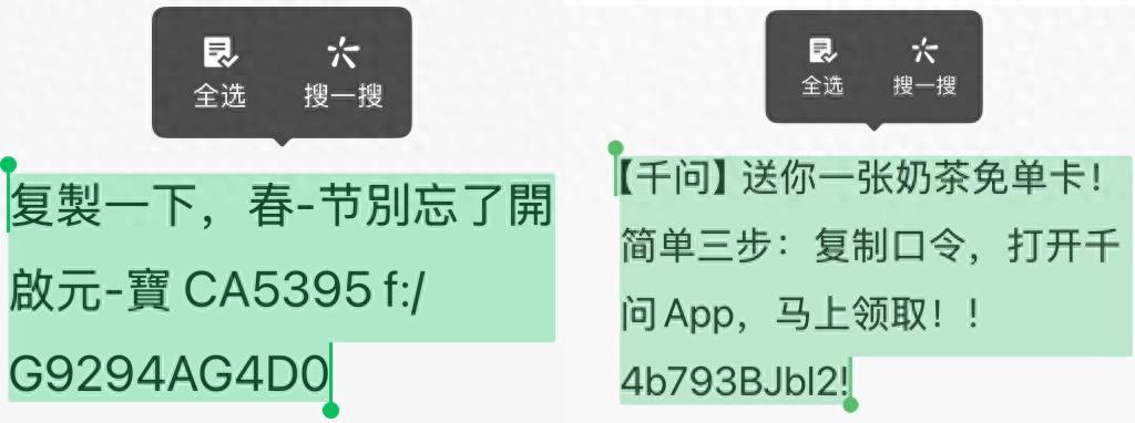 左为元宝红包口令链接,右为千问口令链接