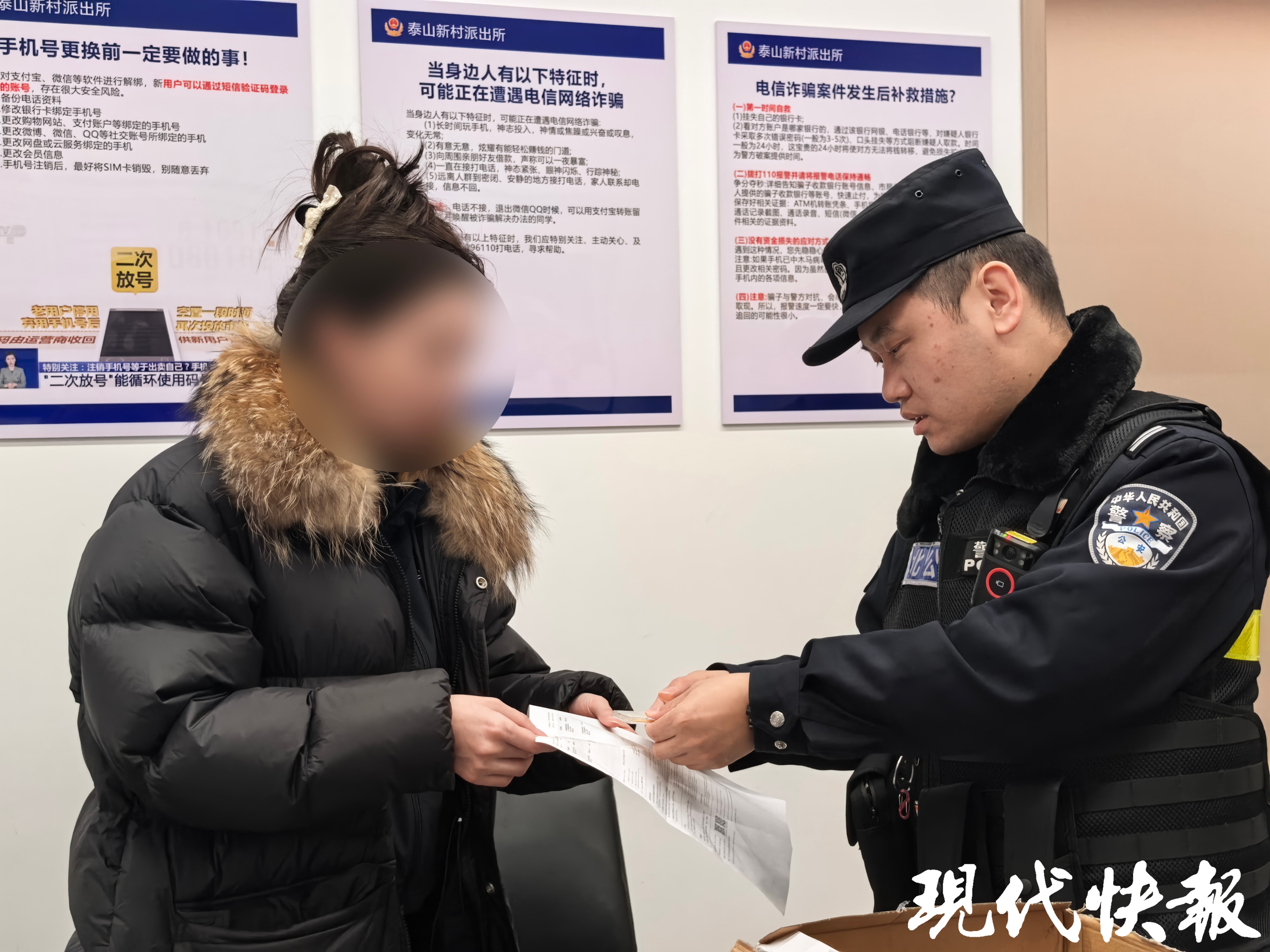 1月10日8时许,泰山新村派出所接到反诈预警:居民张女士可能遭遇诈骗。派出所综合指挥室立即启动应急拦截机制,民警第一时间找到张女士见面,但其抵触情绪强烈,以“借款给朋友”“个人消费”等借口搪塞,拒绝出示手机。