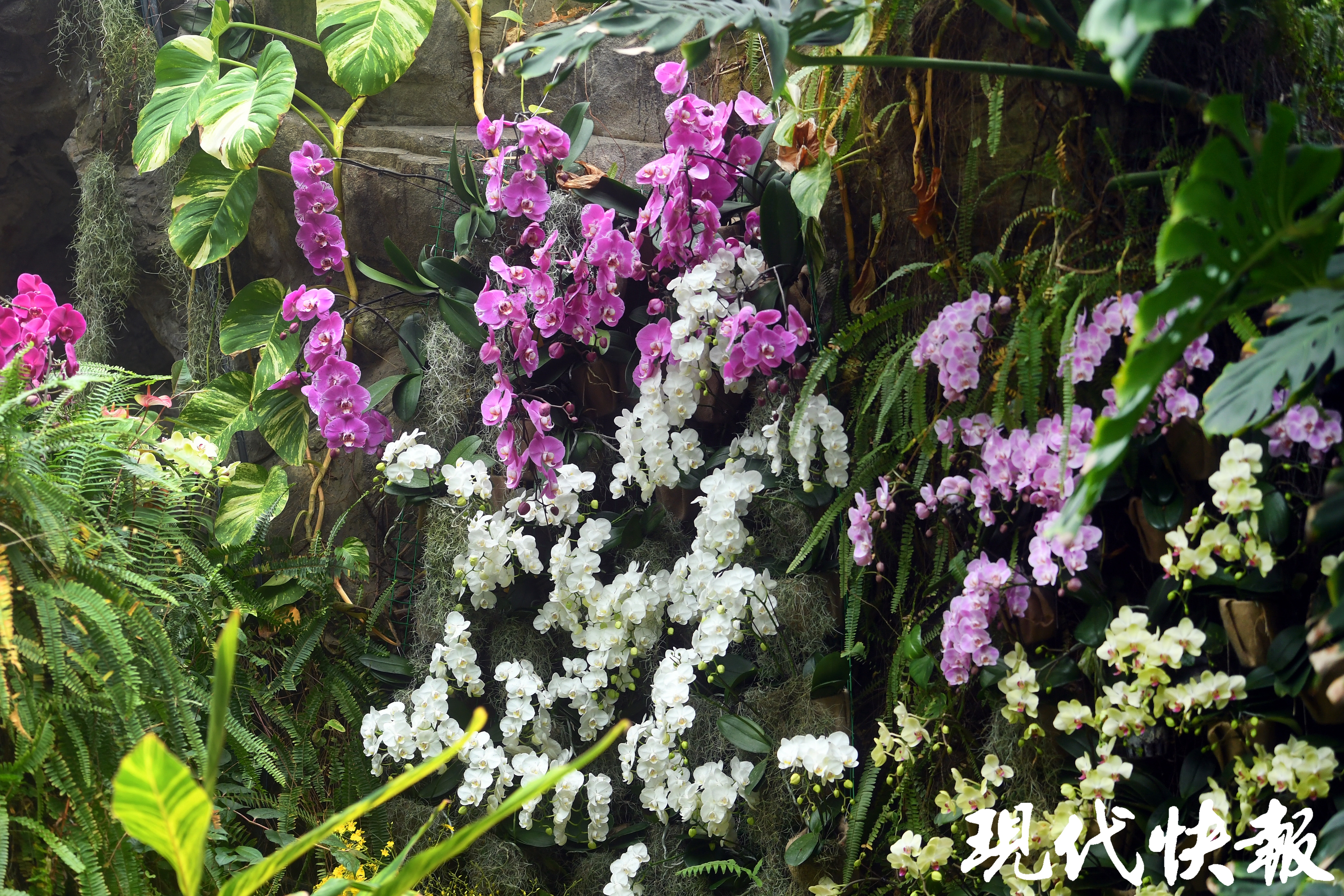 热带经济植物区内,“蝴蝶兰花柱”如芬芳瀑布倾泻而下,成为现场最热门的打卡点;“兰花谷”的悬崖上,各色兰花错落绽放,花影婆娑。热带雨林植物区内,沿着湿润的石阶漫步,兰花星星点点装饰着池塘边、树干上。登高远望,兰花与参天雨林植物共同构成一幅充满野趣与层次的生态画卷。