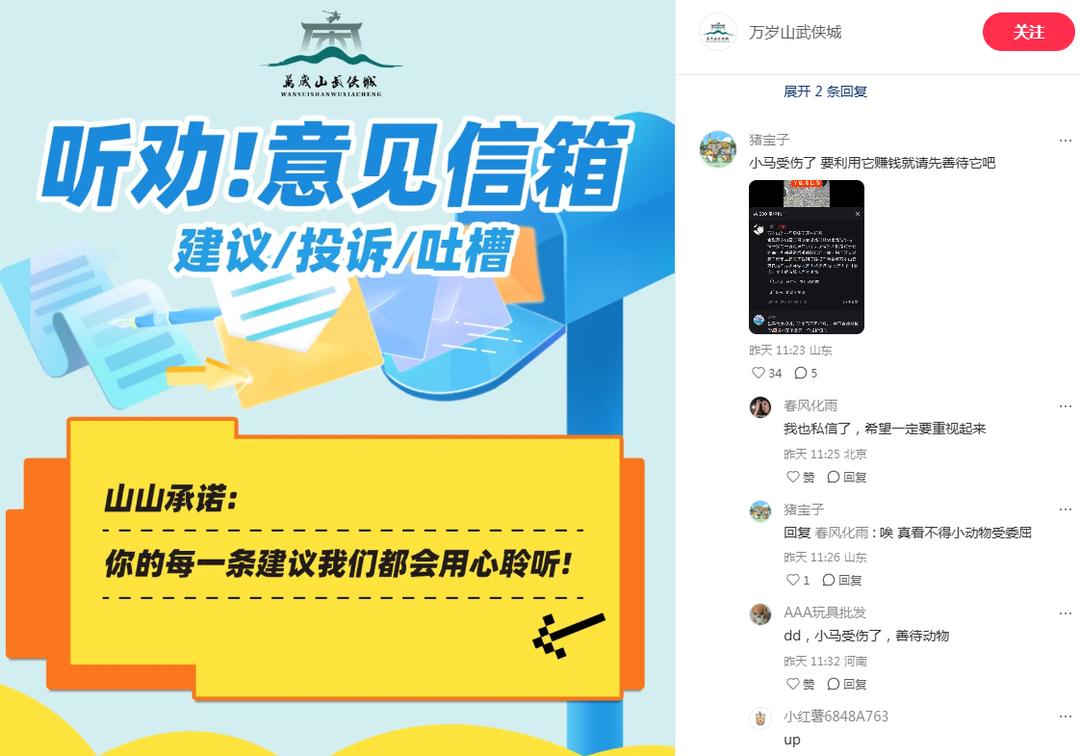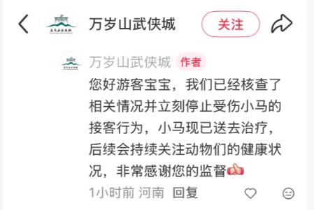 记者注意到,有很多网友来到了景区官方账号下留言,要求善待动物。“希望一定重视起来”“小马受伤了,请善待动物”…… 而据最新消息反馈,景区已停止小马接客行为,目前正在接受治疗。“我们已经核查了相关情况并立即受伤小马的接客行为,小马现已送去治疗,后续会持续关注动物们的健康状况。”对此,网友表示,希望园区能通过视频或者照片,向大家公布这匹小马的治疗和恢复情况。