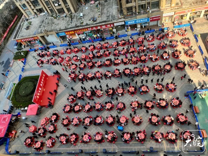 上午11点,百家宴活动即将开始,居民们陆陆续续来到广场入口。几位身穿红马甲的志愿者微笑着检票、引导。广场被一圈护栏围起,周围有志愿者维护秩序,外围则站满了翘首观看的居民,不少孩子踮着脚尖,趴在护栏上向里张望。场地内110张铺着红桌布的圆桌整齐排开,红色背景幕布上书写:“一宴聚百家共庆好时光”,电吹管乐团表演、唢呐演奏、彩带舞和川剧变脸等节目热闹上演。活动现场还同步开展“迎新春、送春联”活动。