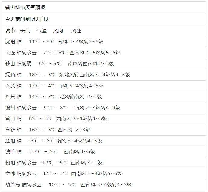 【气温】全省最高气温2~9度,朝阳最暖。早间最低气温-2~-18度,抚顺最冷。