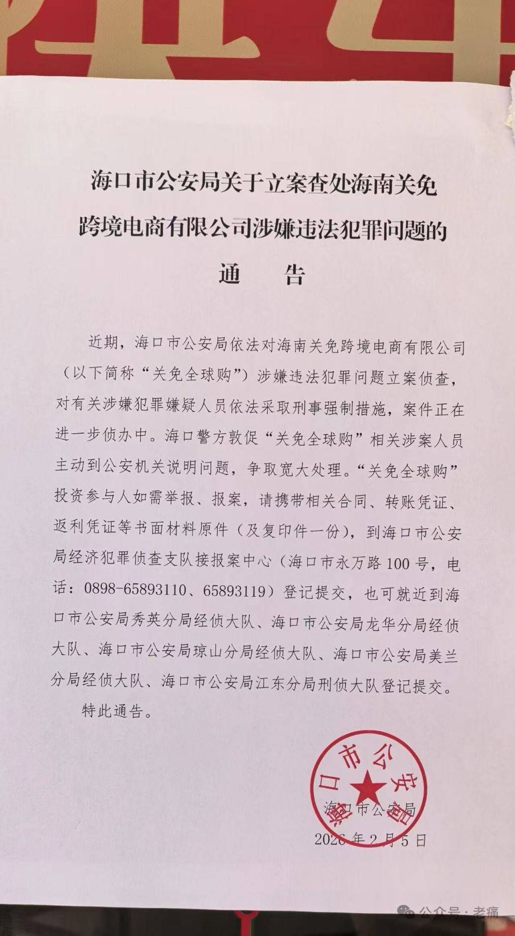 2月5日,海口市公安局发布《关于征集“关免全球购”涉嫌违法犯罪线索的通告》(以下简称:《通告》)称,该局依法对海南关免跨境电商有限公司(对外简称“关免全球购”)涉嫌违法犯罪问题进行立案侦查,并对该公司实际控制人及相关管理人员等8名犯罪嫌疑人依法采取刑事强制措施。为依法惩治犯罪、保护投资人合法权益,现向社会公开征集“关免全球购”相关违法犯罪线索。