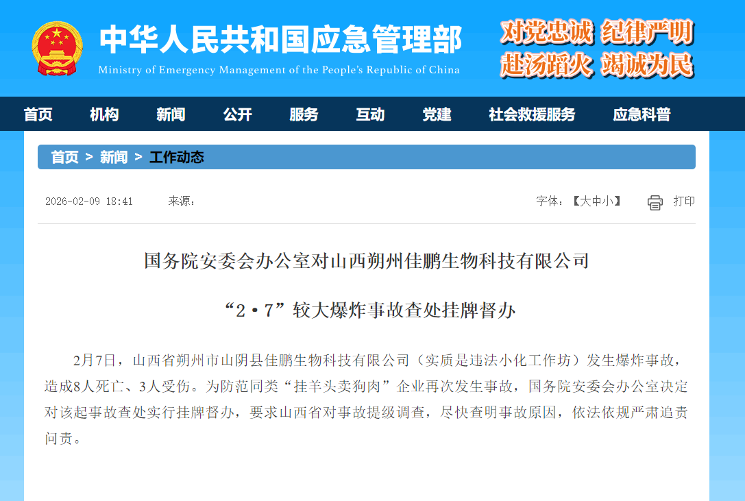 据应急管理部消息,2月7日,山西省朔州市山阴县佳鹏生物科技有限公司(实质是违法小化工作坊)发生爆炸事故,造成8人死亡、3人受伤。为防范同类“挂羊头卖狗肉”企业再次发生事故,国务院安委会办公室决定对该起事故查处实行挂牌督办,要求山西省对事故提级调查,尽快查明事故原因,依法依规严肃追责问责。