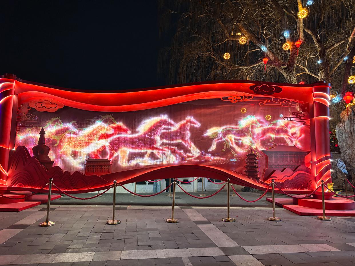 在西城区什刹海荷花市场,布置了一幅以经典横披国画为创作根基,用现代光影技术、轻量化金属结构重构传统水墨意境的主题装置。西城区城市管理委员会街景管理科工作人员鲍艳介绍:“白天,鼓楼的青砖灰瓦与奔马造型虚实相映。夜幕降临,水墨质感的马群仿佛从画中奔出,与鼓楼的璀璨灯火交相辉映,构成一幅独属于荷花市场的动态新春画卷。”