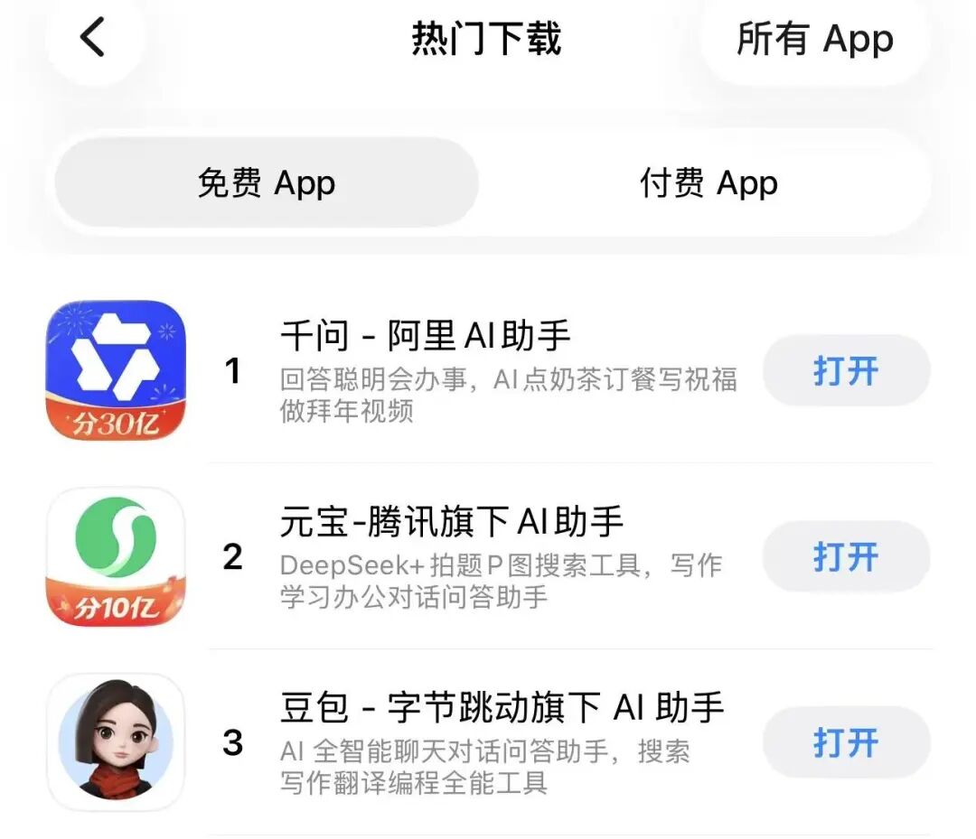 截至2月10日,千问已登顶苹果App Store免费应用榜,稍早前上线新春红包活动的元宝排名第2名,豆包排第3名。公开报道显示,目前,腾讯、百度、阿里、字节跳动等互联网大厂掀起AI大战,已透露的红包金额合计45亿元。