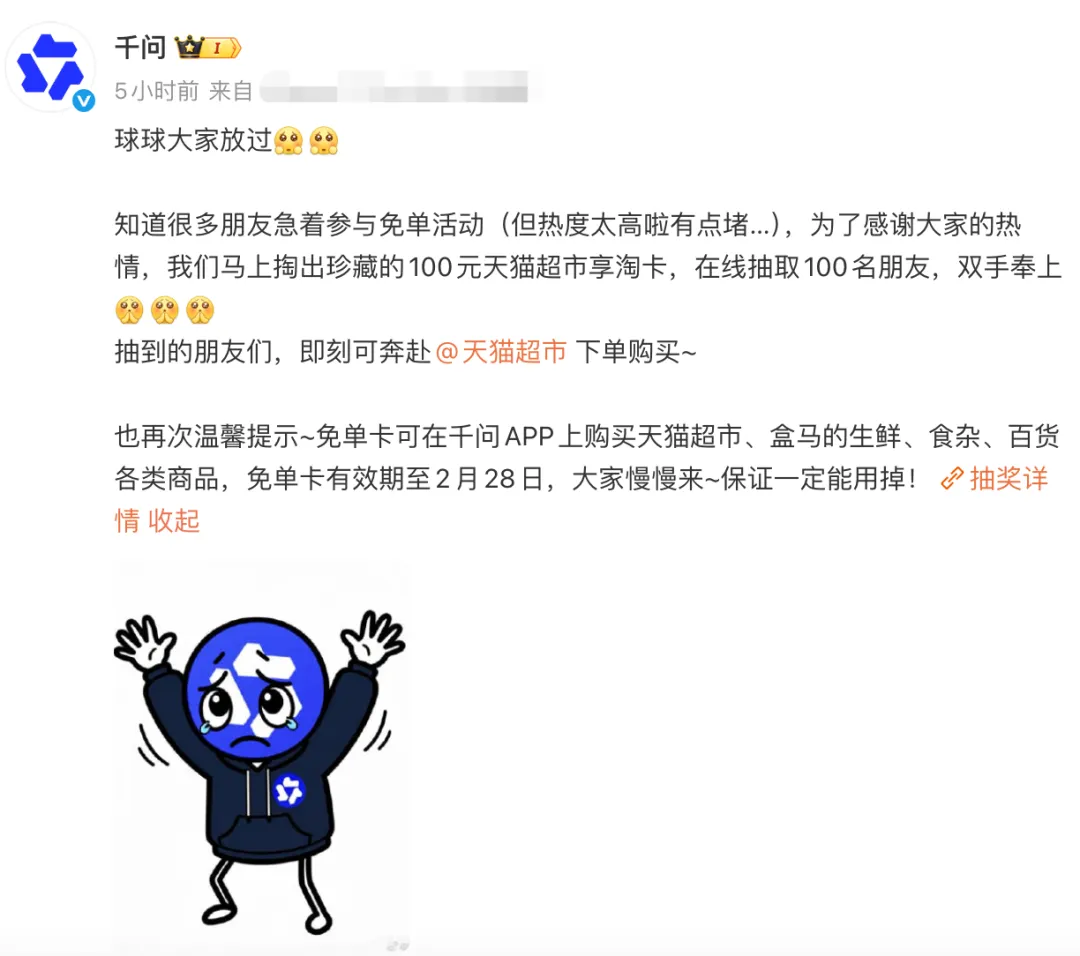 2月8日,又有用户反映千问APP崩了。当天下午千问发文称“球球大家放过”,知道很多朋友急着参与免单活动,但热度太高有点堵。千问再次提醒免单卡有效期至2月28日,“大家慢慢来,保证一定能用掉!”