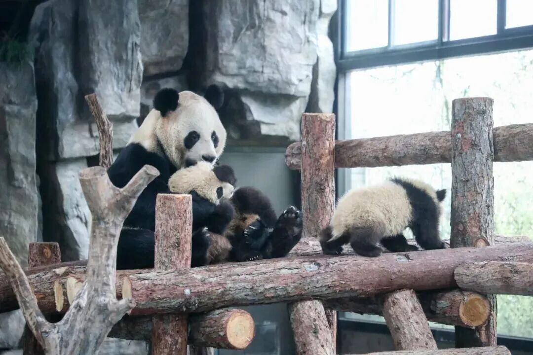 据保育员介绍,当“芊金”顺利诞下“芊然”和“芊逸”时,面对“芊金”同时哺育双崽可能带来的风险,保育团队采用了“母带幼为主、人工辅助为辅”模式,24小时轮班监测、营养强化配方奶补充等措施,确保“芊金”与幼崽健康。经过170余天的精心呵护,“芊然”和“芊逸”现均由“芊金”妈妈哺育。