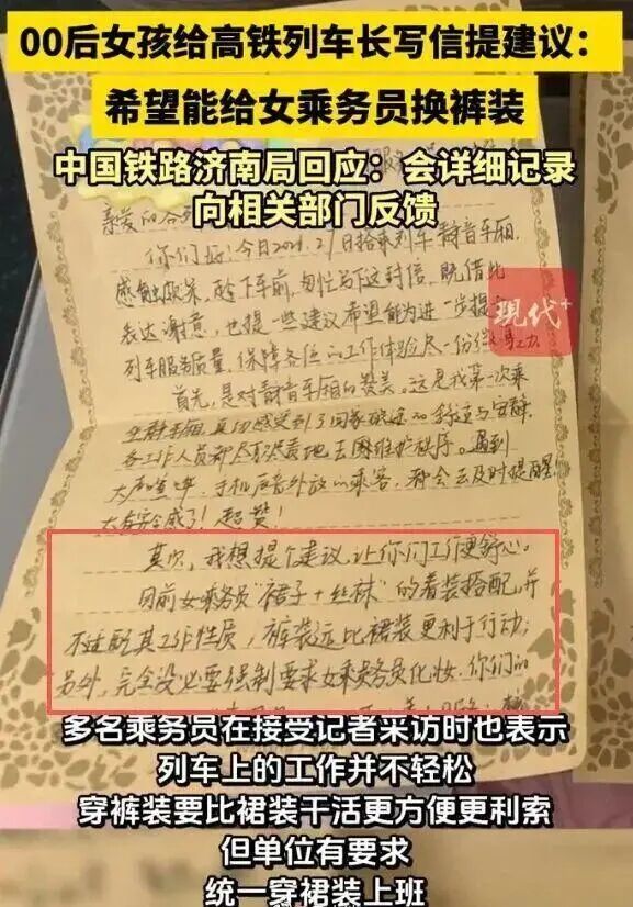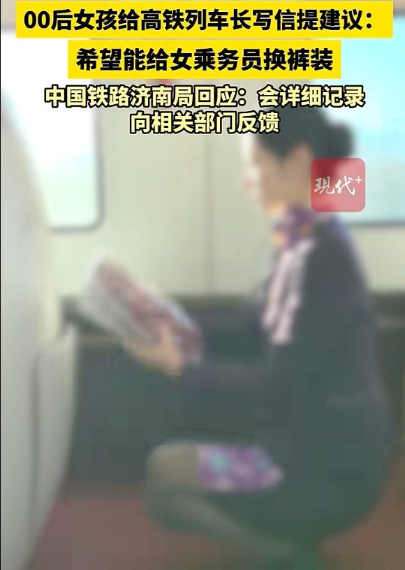 近日,一名女子搭乘高铁时发现,车上的女乘务员都穿着统一的裙装制服和肉色袜子,看上去并不舒适,工作、走路都不如裤装方便。她拿出随身携带的纸笔,写信给列车长,希望能将女乘务员的裙装改成裤装。这一帖子发布后,引发众多网友共鸣,点赞数超过2万次。