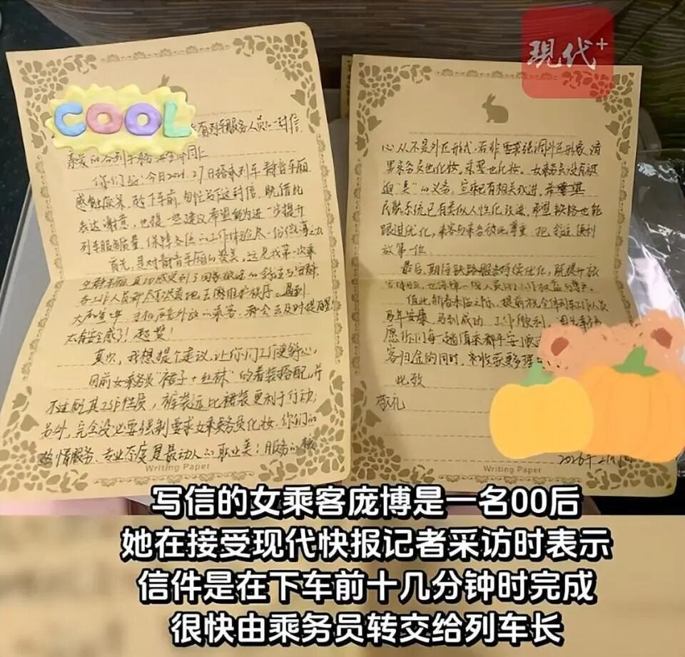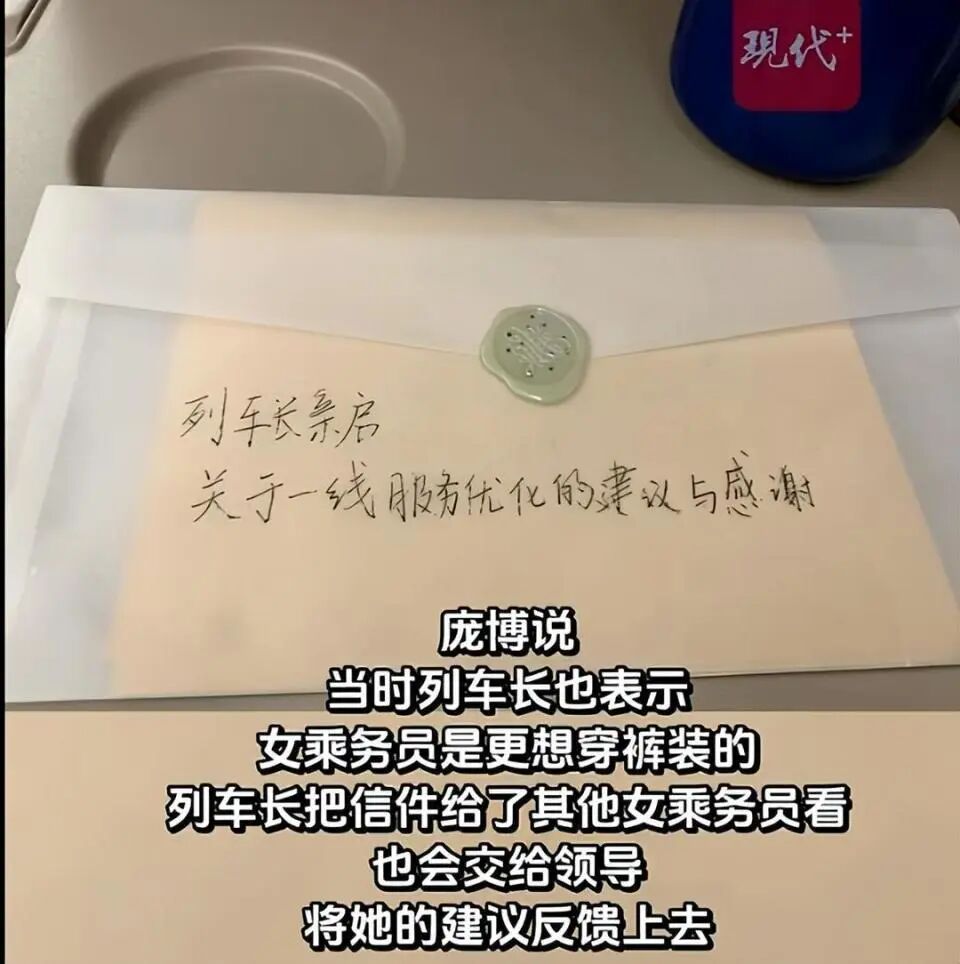 这次庞博回老家,随身带着纸笔和信封。针对列车上看到的这一幕,便萌生了手写信提建议的念头。“当时我已经观察了两个多小时,认为这个问题是确实需要发声的,便决定来做这件事。”庞博在下车前十几分钟完成了信件。庞博把信交给了一名乘务员,很快就转交到了列车长手里。列车长是一名女性,看完信后很快就到了她的座位前。“她蹲在我的座位前,双手握住我的手,说很认真地看完了信的内容,很感谢我提出了这样的建议。”庞博说,当时列车长也表示,女乘务员是更想穿裤装的,列车长把信件给了其他女乘务员看,也会交给领导,将她的建议反馈上去。