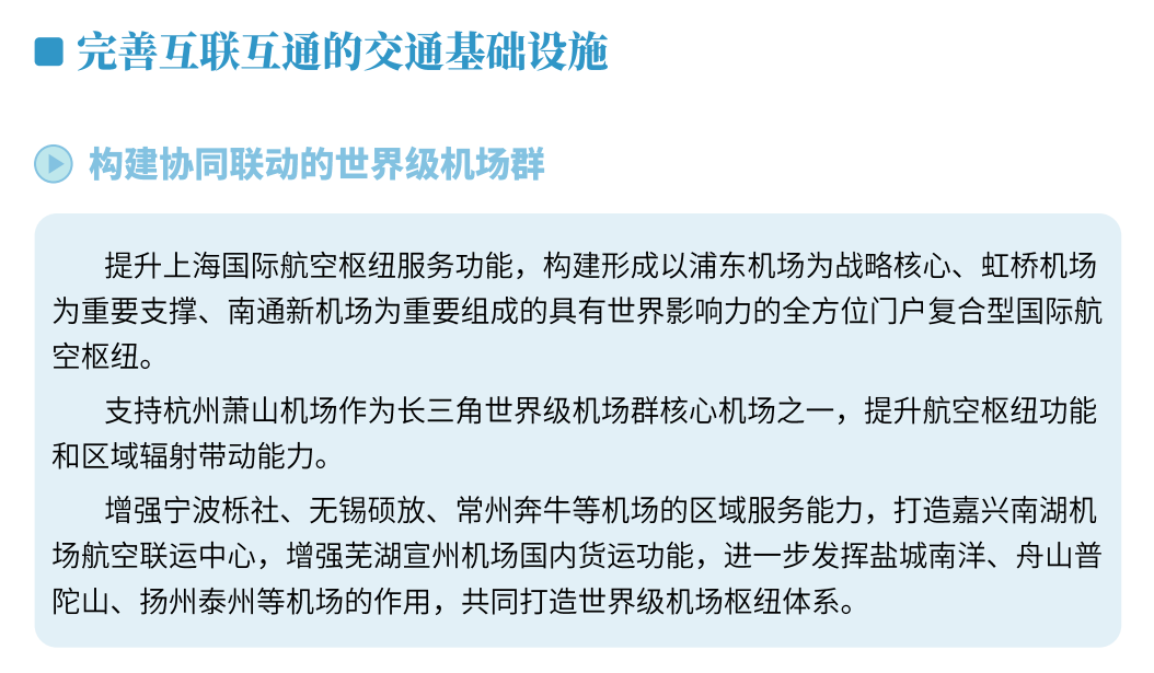此次公示的《规划》草案提出,增强协作共进的区域竞争优势,完善互联互通的交通基础设施,构建协同联动的世界级机场群。提升上海国际航空枢纽服务功能,构建形成以浦东机场为战略核心、虹桥机场为重要支撑、南通新机场为重要组成的具有世界影响力的全方位门户复合型国际航空枢纽。