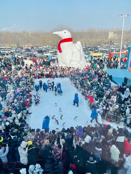“淘学企鹅”“打卡”太阳岛雪博会。新华社发