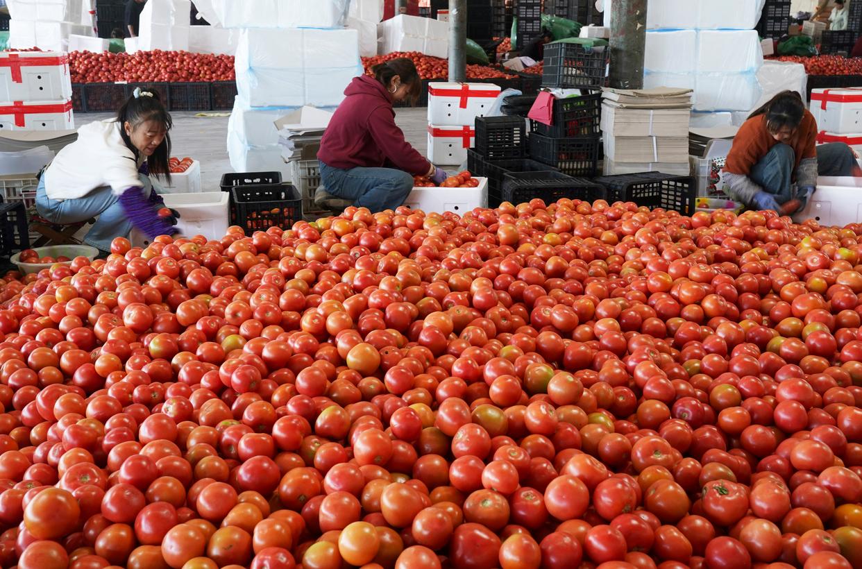 1月14日,在云南省元谋县果蔬综合批发市场,村民在分拣番茄。新华社发(梁志强 摄)
