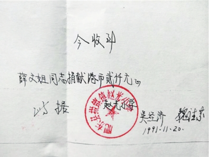 薛文姐拿出两千元港币捐给赵光小学。