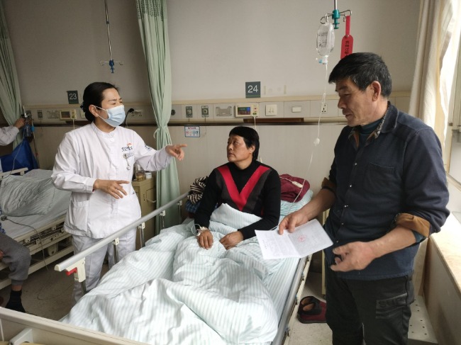 薛文姐告诉记者,2022年夏天,她发现自己“干活时气喘吁吁,干不动活”,当时以为是感冒引起的,一开始没有重视。2022年9月9日,她前往撮镇当地医院就诊,治疗三天之后发现情况更加严重了,经过转院检查,最终确诊为肺癌晚期。从四个月前开始,她每21天需要来医院化疗一次,一共18次。“今天是第六次,”张国忠说道,“医生说到后期化疗间隔时间会适当拉长。”