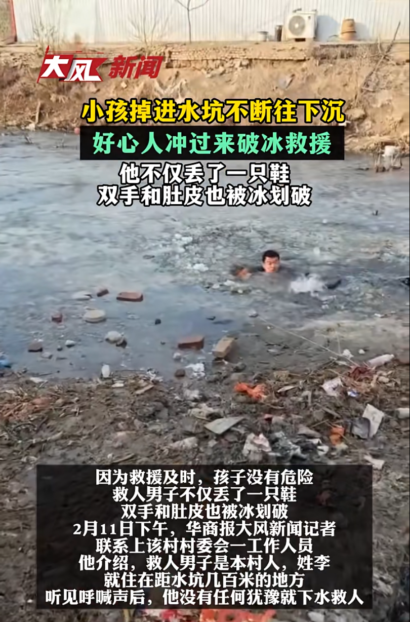 2月11日下午,华商报大风新闻记者联系上该村村委会一工作人员,他介绍,水坑有1米多深,存储的主要是雨水,救人男子是本村人,姓李,就住在距水坑几百米的地方,听见呼喊声后,他没有任何犹豫就下水救人。