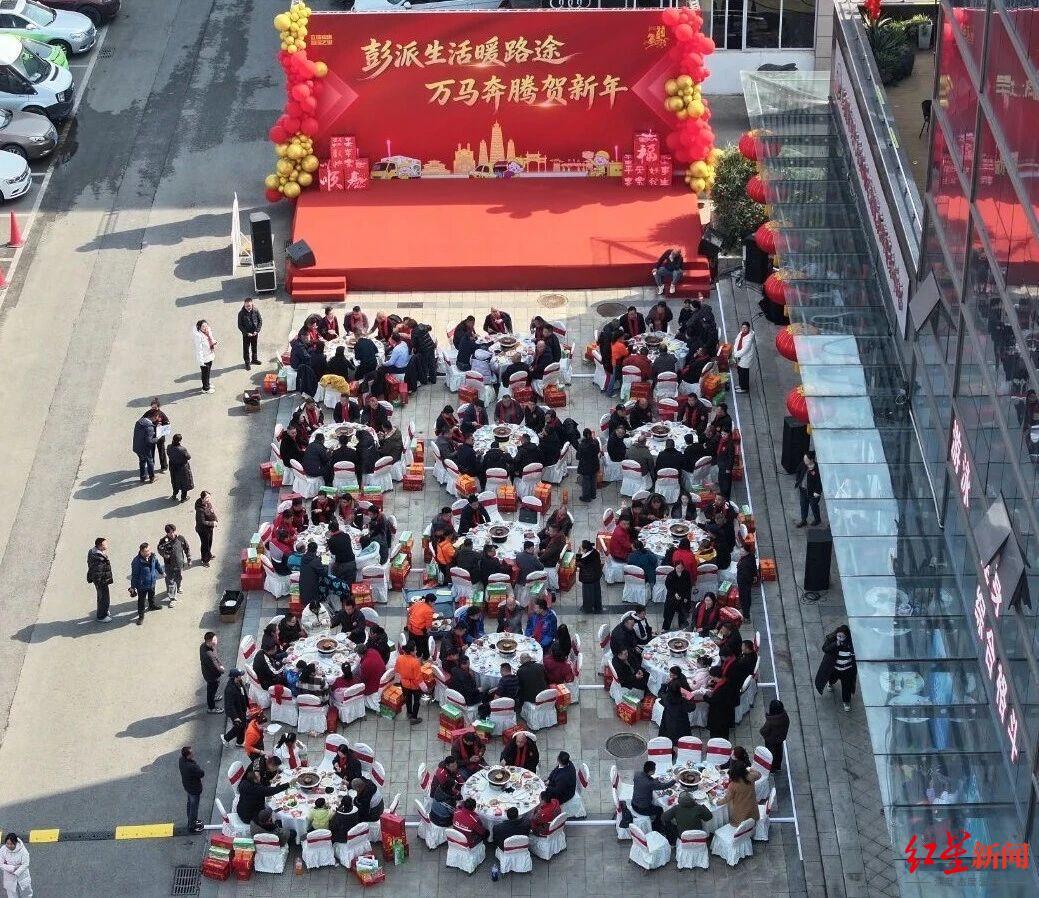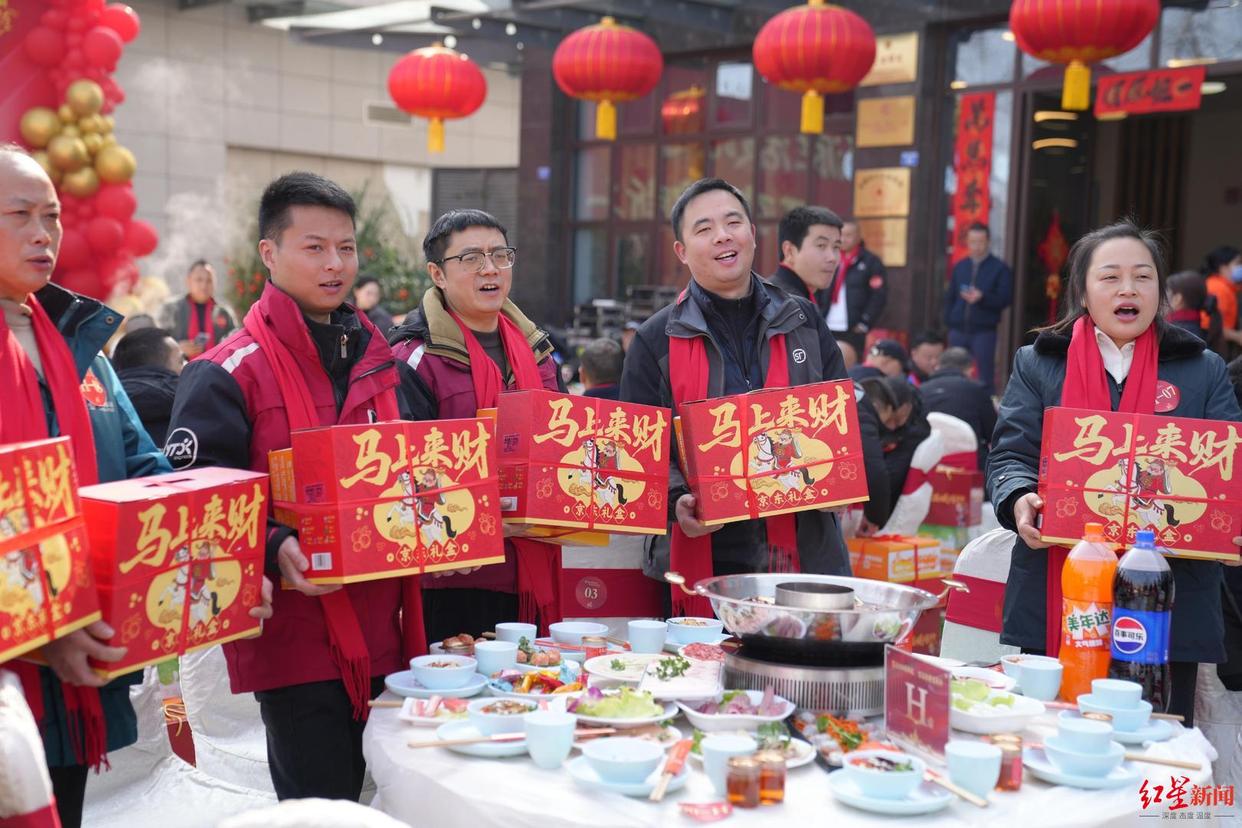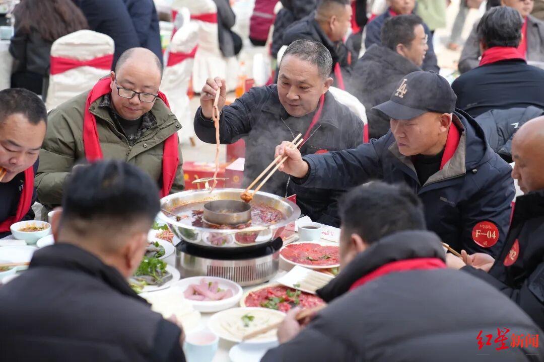 中午时分,一份份精心准备的慰问礼包,送到了每一位司机和快递员代表手中,感谢他们这一年的风雨兼程。随后,地道的彭州火锅宴正式开席,红汤翻滚、香气四溢,来自天南地北的人们围坐在一起。虽然口音不同、故事各异,但此刻,快乐是一致的。“平时都是一个人在路上,吃快餐是常事,今天这么多人一起吃饭,热闹得像在老家过年。”一位网约车司机边烫菜边感慨。