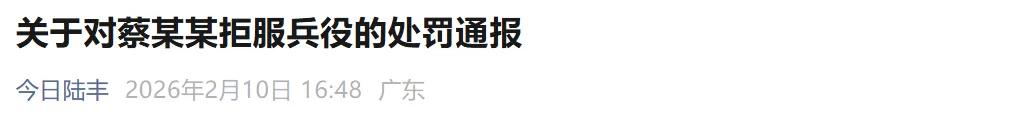 2月11日,陆丰市人民政府征兵办公室关于对蔡某某拒服兵役的处罚通报。全文如下: