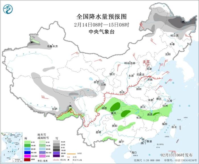 图1全国降水量预报图(2月13日08时-14日08时)图片来源:中央气象台网站