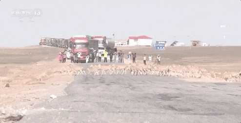 藏羚羊列队穿越青藏公路,步伐不疾不徐。来往的车辆远远停住,没有人鸣笛,没有人打扰,只是静静地看着,见证人与自然和谐共生的一幕。