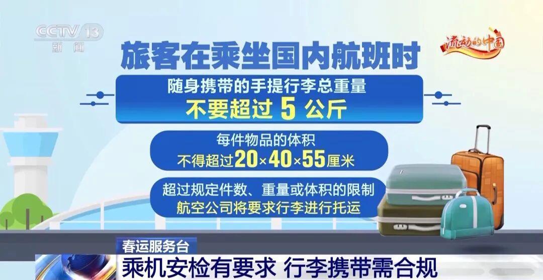 旅客乘坐国内航班时,随身携带的手提行李总重量不要超过5公斤,每件物品的体积不得超过20×40×55厘米。