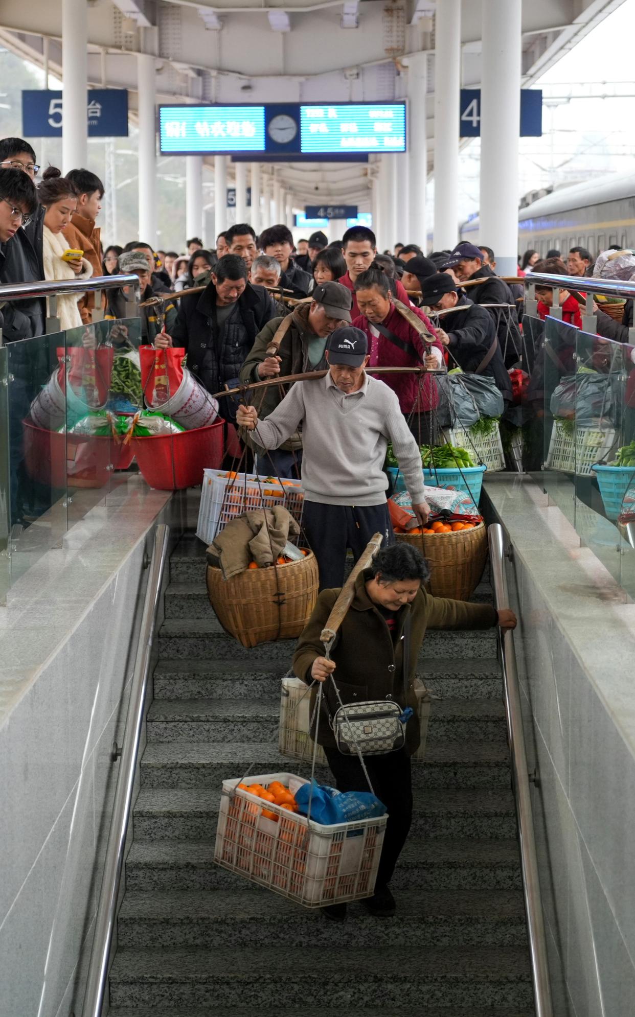 2月12日,在贵州省铜仁市铜仁火车站,来自湖南的村民带着蔬果准备乘坐无障碍电梯出站。新华社发(龙建睿 摄)