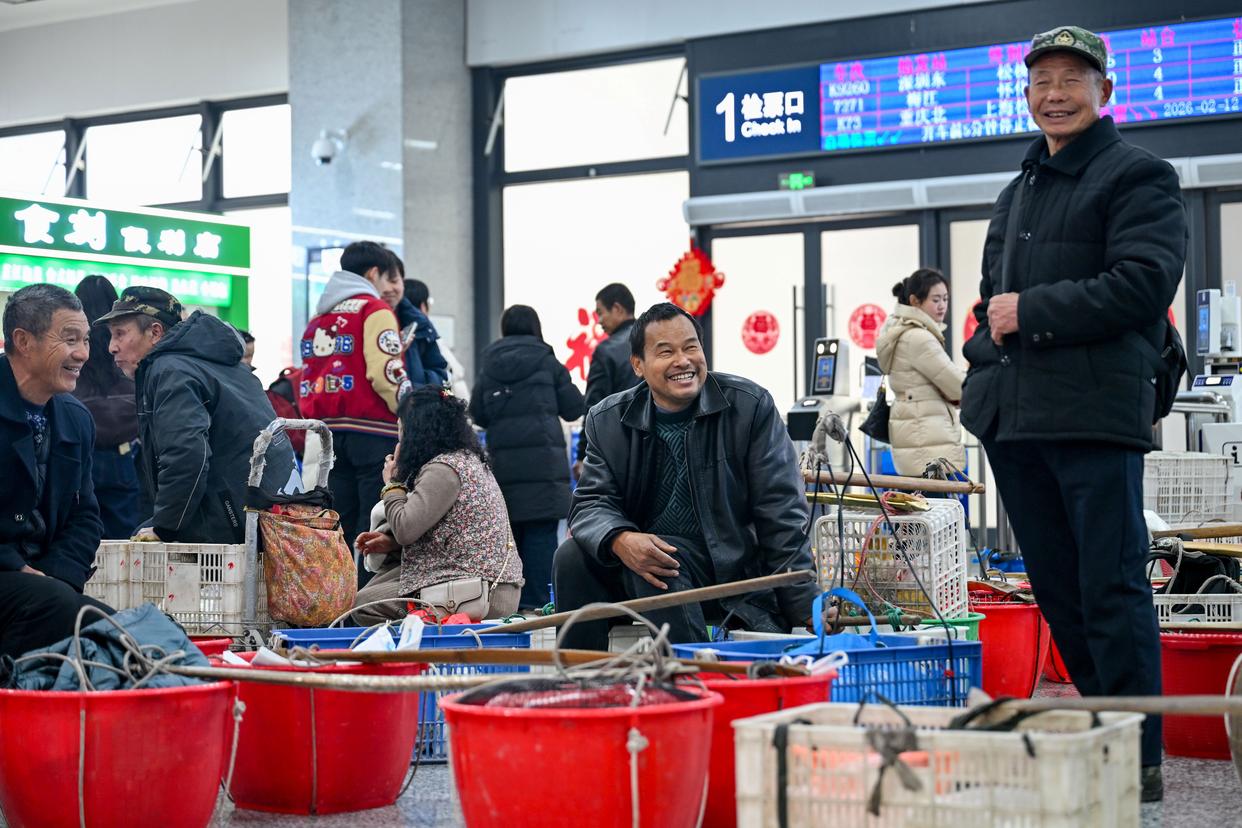 2月12日,在贵州省铜仁市铜仁站候车厅,来自湖南的菜农卖完果蔬后在一起交流。新华社发(袁福洪 摄)