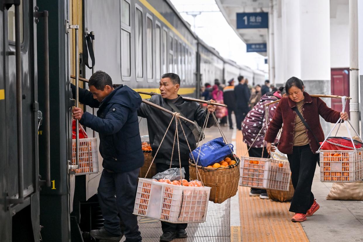 2月12日,7272次公益性慢火车停靠在湖南省锦和站,菜农挑着新鲜果蔬准备乘车运往贵州铜仁销售。新华社发(袁福洪 摄)