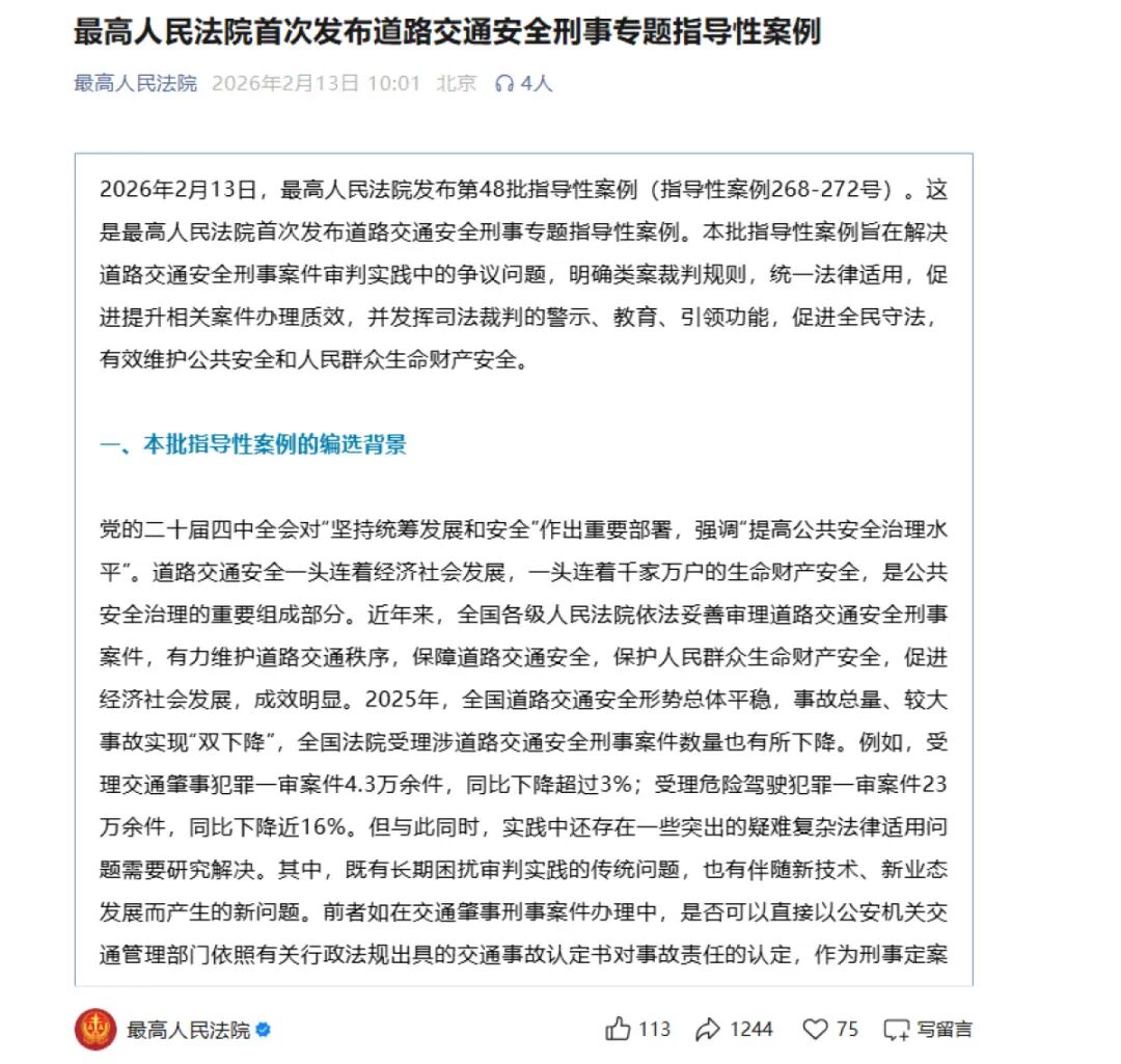 2026年2月13日,最高人民法院发布第48批指导性案例,这是最高法首次针对道路交通安全刑事案件专门发布指导性案例。5个典型案件涵盖毒驾肇事、逃逸责任认定、醉驾取证程序、辅助驾驶责任、醉驾共犯等争议焦点,旨在统一裁判标准,为全国法院审理同类案件提供参照。