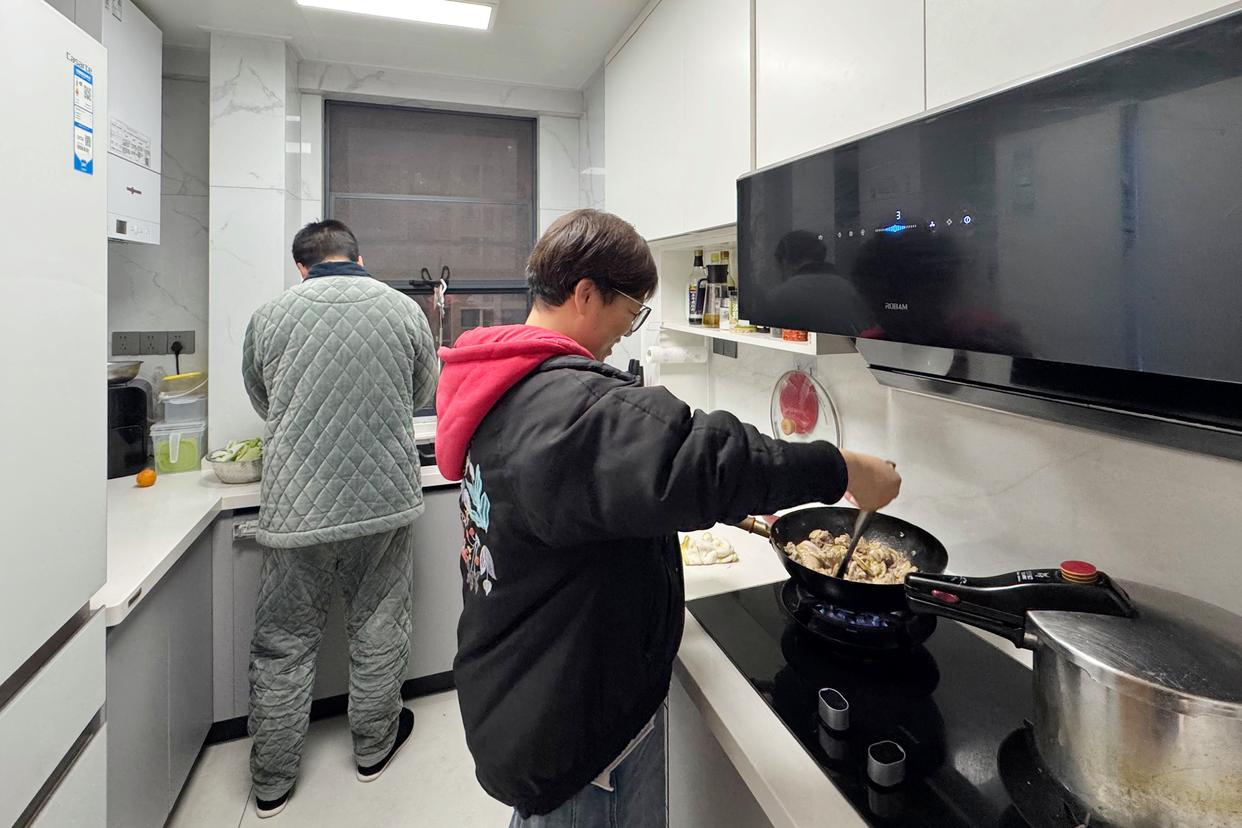夫妻俩在厨房里忙碌着。新华社发回家后